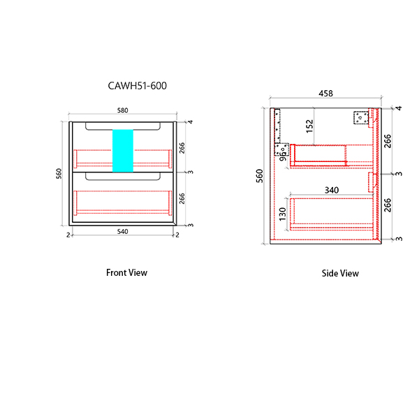 580 x 450 x 540mm 2 Draws