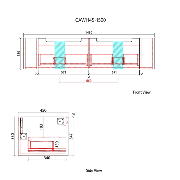 1480 x 450 x 350mm 2 Draws